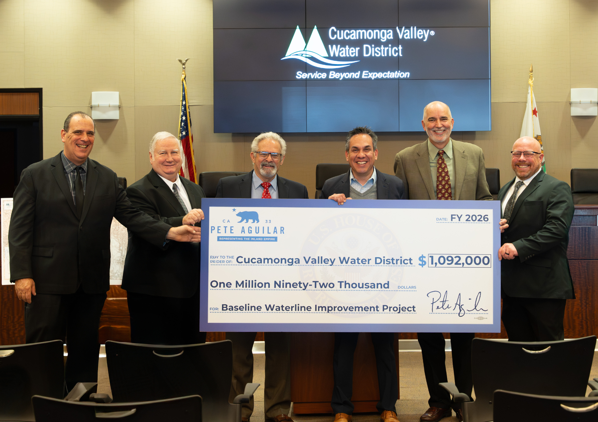 Rancho Cucamonga, CA — On February 18, 2026, the Cucamonga Valley Water District (CVWD) welcomed Congressman Pete Aguilar for a ceremonial check presentation recognizing $1.092 million in federal funding secured through the Community Project Funding program. The funding will support CVWD’s Baseline Waterline Replacement Project, a critical infrastructure investment benefiting the local community.